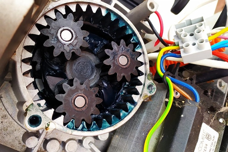 Автоматика разбирается без демонтажа, непосредственно на воротах. Внутри корпуса меняется смазка.